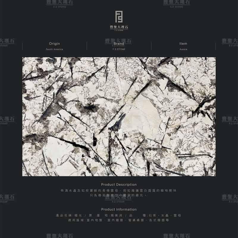 |新貨到·極光|New Arrival名稱極光石材產地巴西石材品種石英岩、水晶、雲母適用區域室內地面、室內牆面、餐桌、各式檯面等Share: 分享本篇文章: |極光|佈滿水晶及如枝葉般的長條雲母,宛如踏遍雪白靄靄的極地樹林,只為尋覓那夜空中飄浮的綠光。石材產地|巴西石材品種|石英岩、水晶、雲母適用範圍|室內地面、室內牆面、餐桌、各式檯面等#世界級藝術奢石展館#震撼您的視覺感官▍立即預約鑑賞 https://lin.ee/hgzsCSX大自然的「石」尚藝術,豐聖邀請所有品味人士一起鑑賞天然的精湛工藝。__________________________________▍豐聖官方網站 https://fsstone.com.tw▍VOGUE台灣專訪 https://reurl.cc/bnxbkX▍東森新聞專訪 https://reurl.cc/qgWN1q▍ETtoday陳昭榮來訪 https://reurl.cc/VEb1jZ▍經濟日報專訪 https://reurl.cc/noGO16▍千萬石材招待所曝光 https://reurl.cc/yE9MrM▍網紅冰蹦拉來訪 https://reurl.cc/dG4W2y 翠玉43 Share: