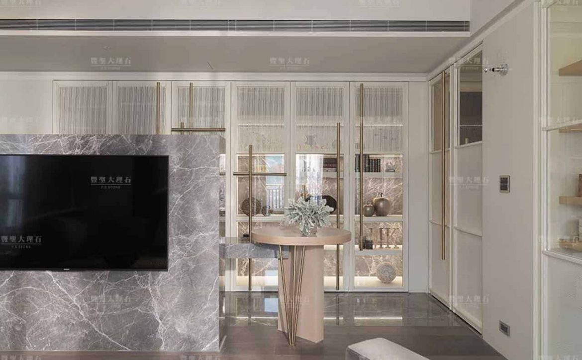 (圖/愛馬仕灰大理石電視牆面,搭配空間嚴選石材大小讓居家更畫龍點睛。來源:豐聖大理石)